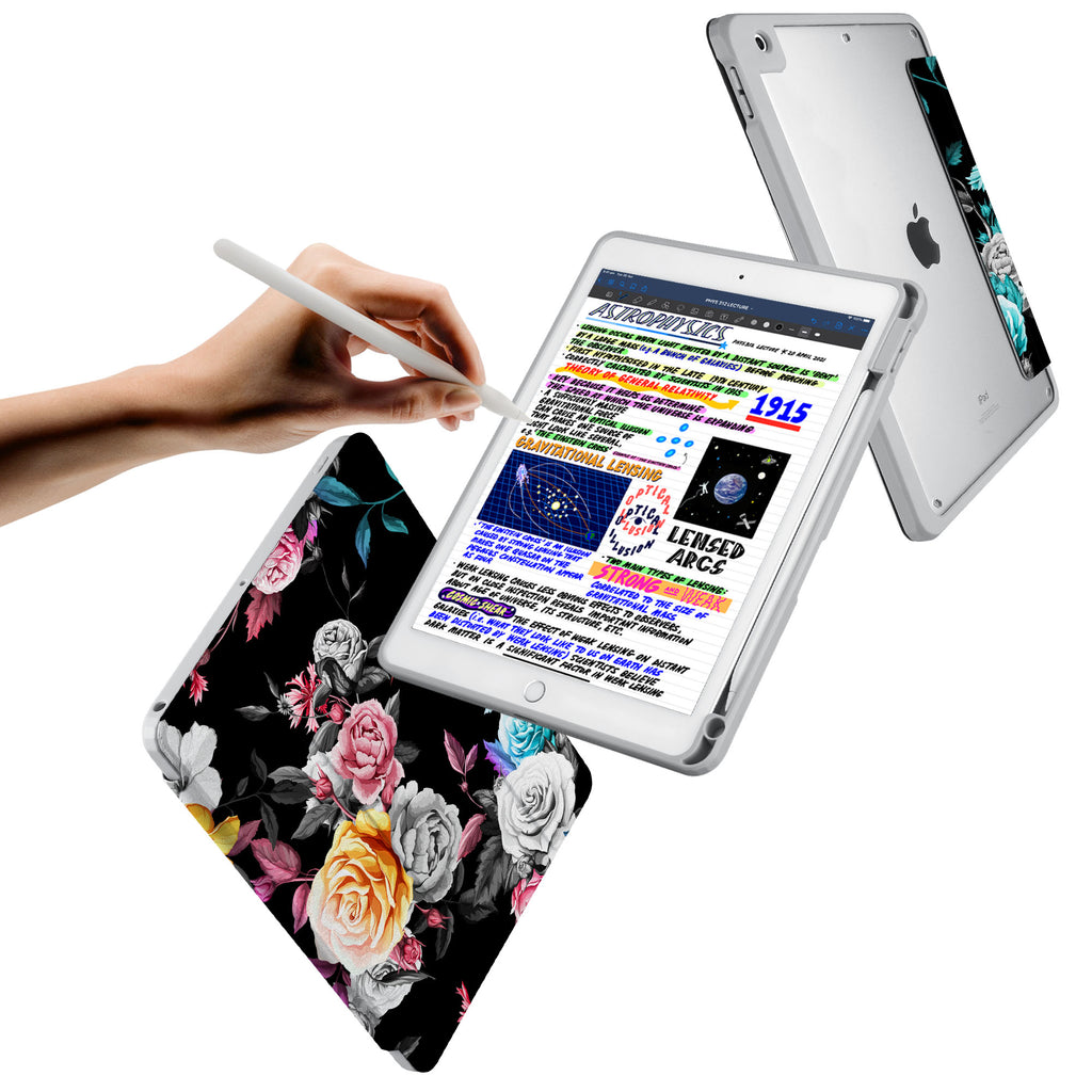 Vista Case iPad Premium Case with Black Flower Design has an integrated holder for Apple Pencil so you never have to leave your extra tech behind. - swap