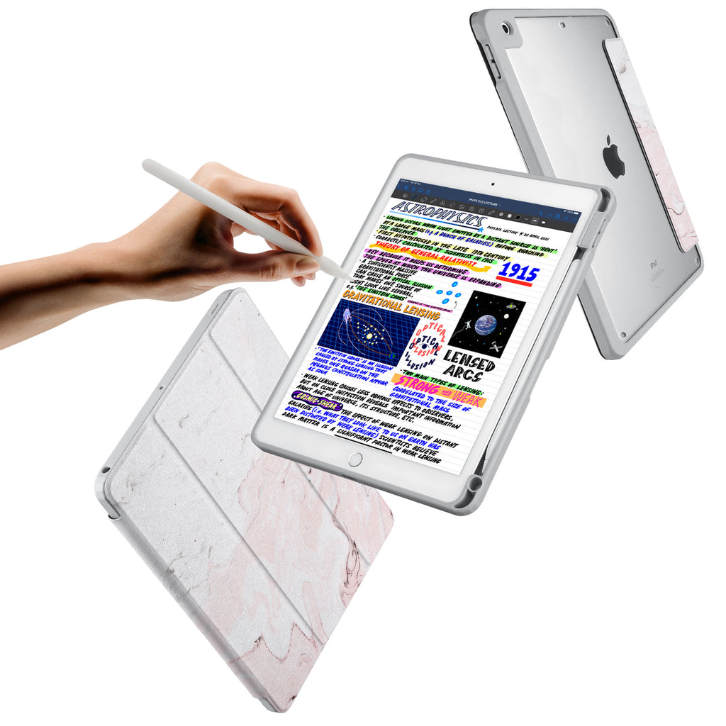 Vista Case iPad Premium Case with Pink Marble Design has an integrated holder for Apple Pencil so you never have to leave your extra tech behind. - swap