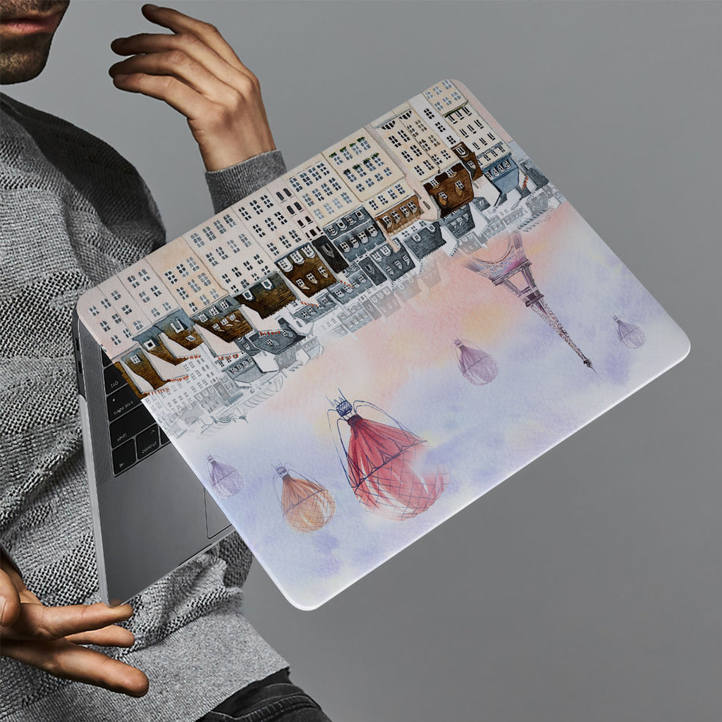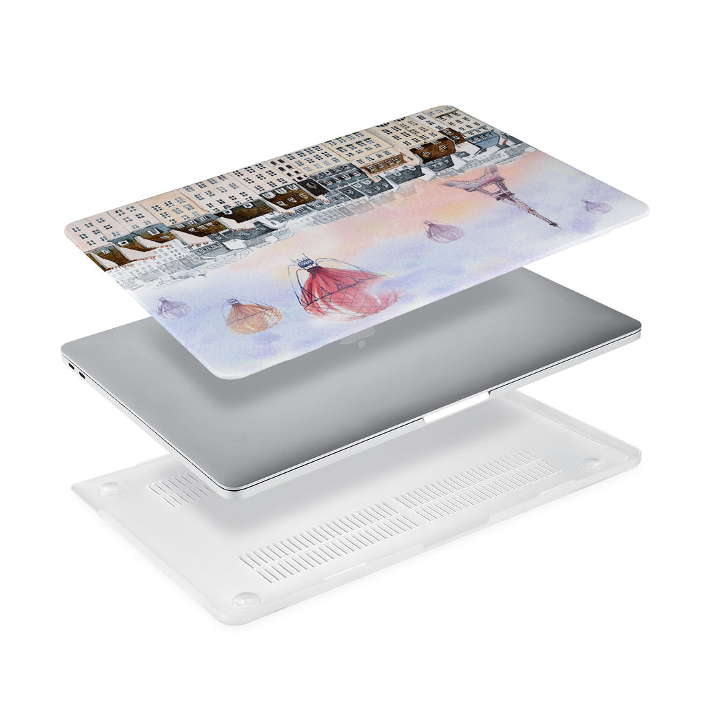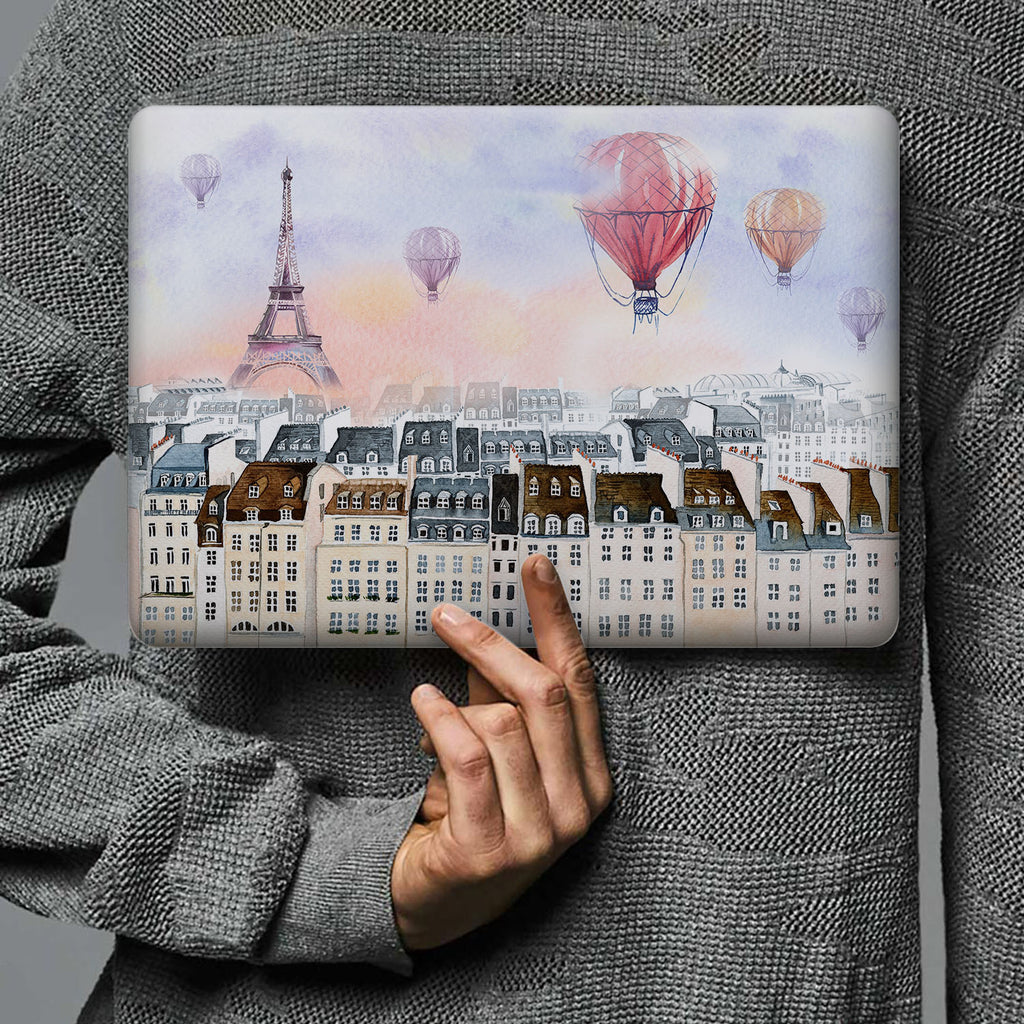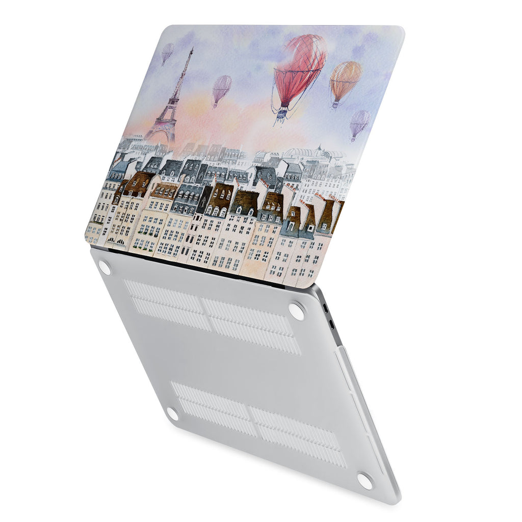 " Express your romantic and adventurous side with this dreamy sketch-like Personalized Macbook Case. It features colorful hot air balloons drifting over Parisian rooftops with the Eiffel Tower in the background. The watercolor paint effect and soothing color palette combine to create a wonderfully whimsical print. "